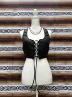 - Bustier style cut: accentuates bust with curved cups & waist with a tapered V-cut front.