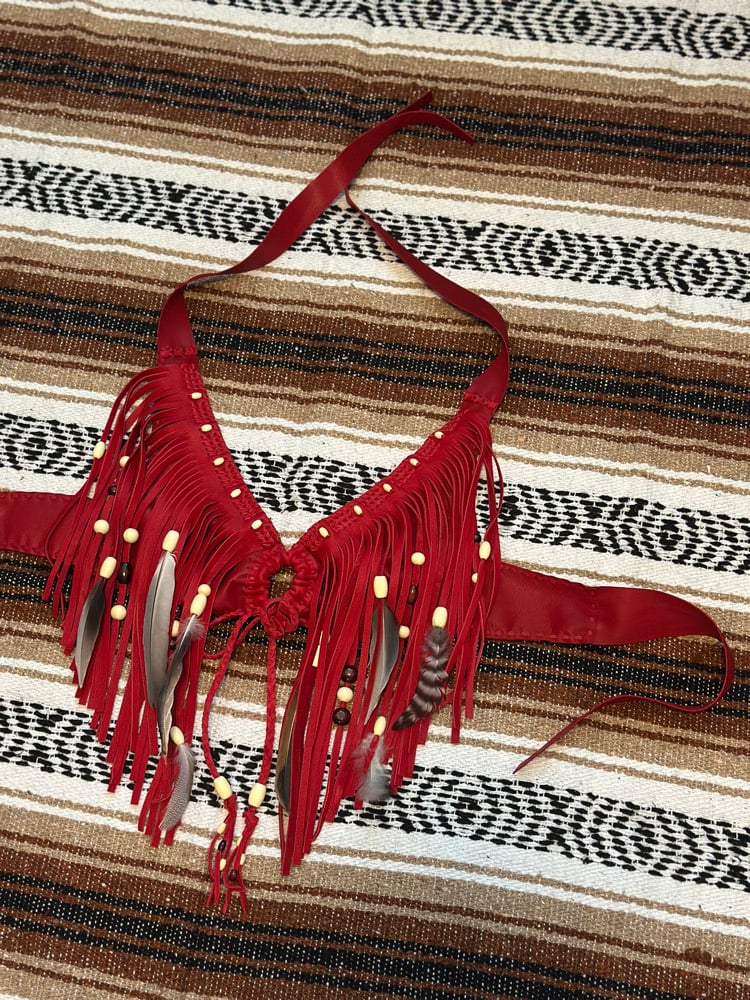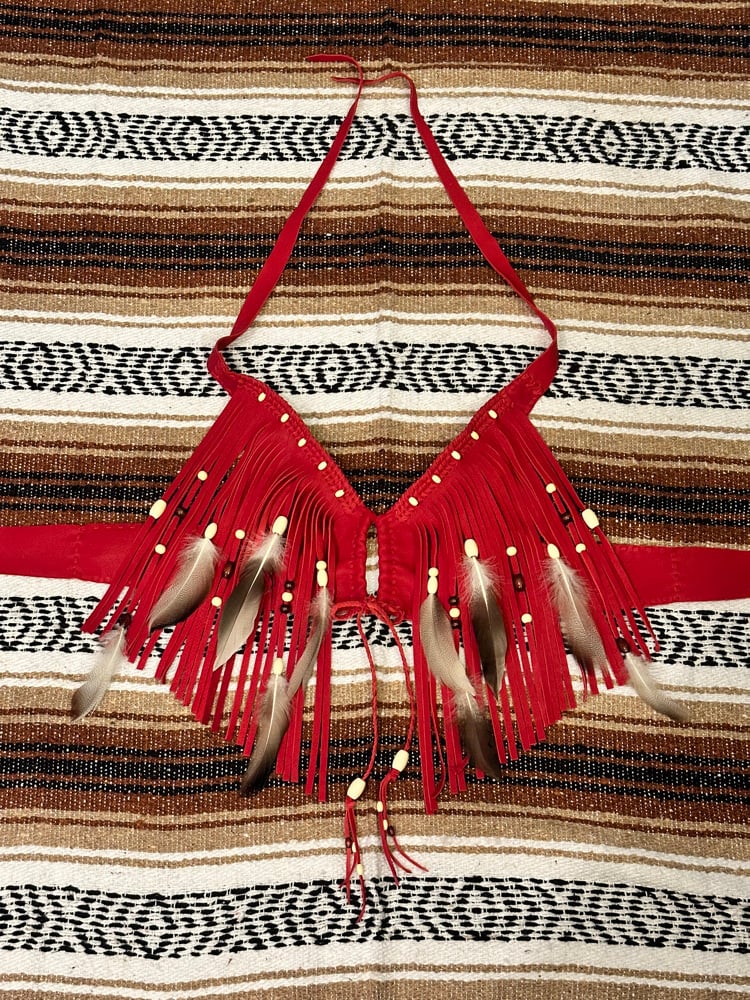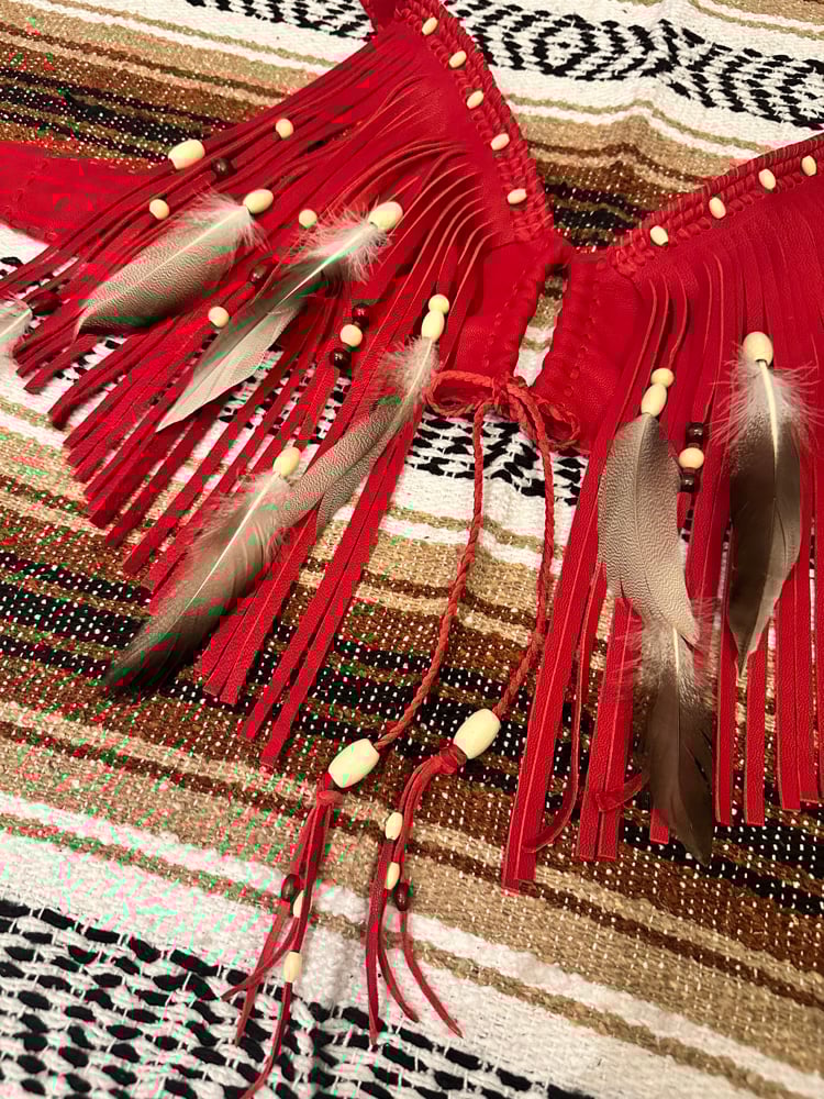 - Intricate V-pattern leather lace with 12 inch long fringe